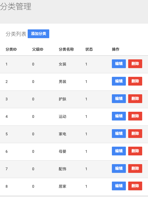 查看商品分类明细和支持新增、编辑、删除等操作