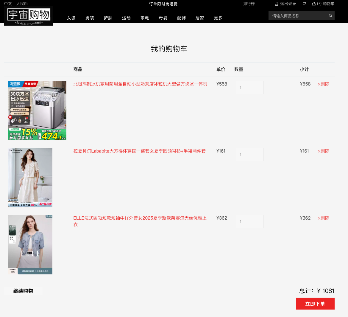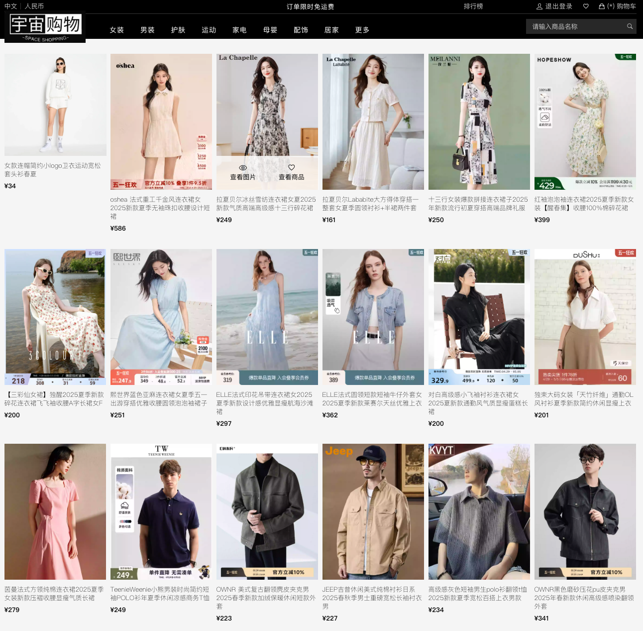 “宇宙购物”(SPACE SHOPPING)的电商平台,整体风格现代、简洁、实用。